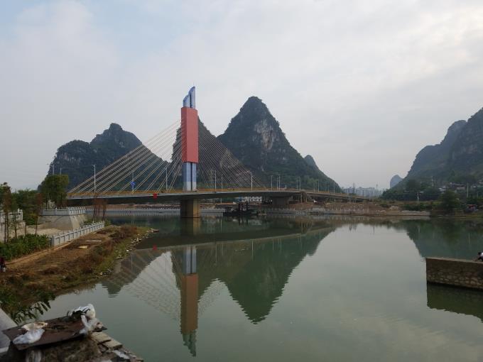 賀州市靈峰大橋工程位于八步區(qū)賀江一橋下游0.9公里處,北岸接靈峰北路,是連接賀江兩岸、緩解城市交通壓力、方便居民的重要通道之一。靈峰大橋設(shè)計(jì)全長(zhǎng)為465.018米,其中南引道長(zhǎng)50.448米,北引道長(zhǎng)80.570米,引道全長(zhǎng)131.018米,橋梁長(zhǎng)度為334米,橋面寬度27米,按雙向四車道設(shè)計(jì)。主橋采用獨(dú)塔單索面預(yù)應(yīng)力混凝土展翅箱梁斜拉橋,邊跨跨徑68米,主跨跨徑86米,全長(zhǎng)154米。橋面以上塔高51米,全橋設(shè)計(jì)共有77根樁基、9個(gè)承臺(tái)、7個(gè)墩身、2個(gè)橋臺(tái)。